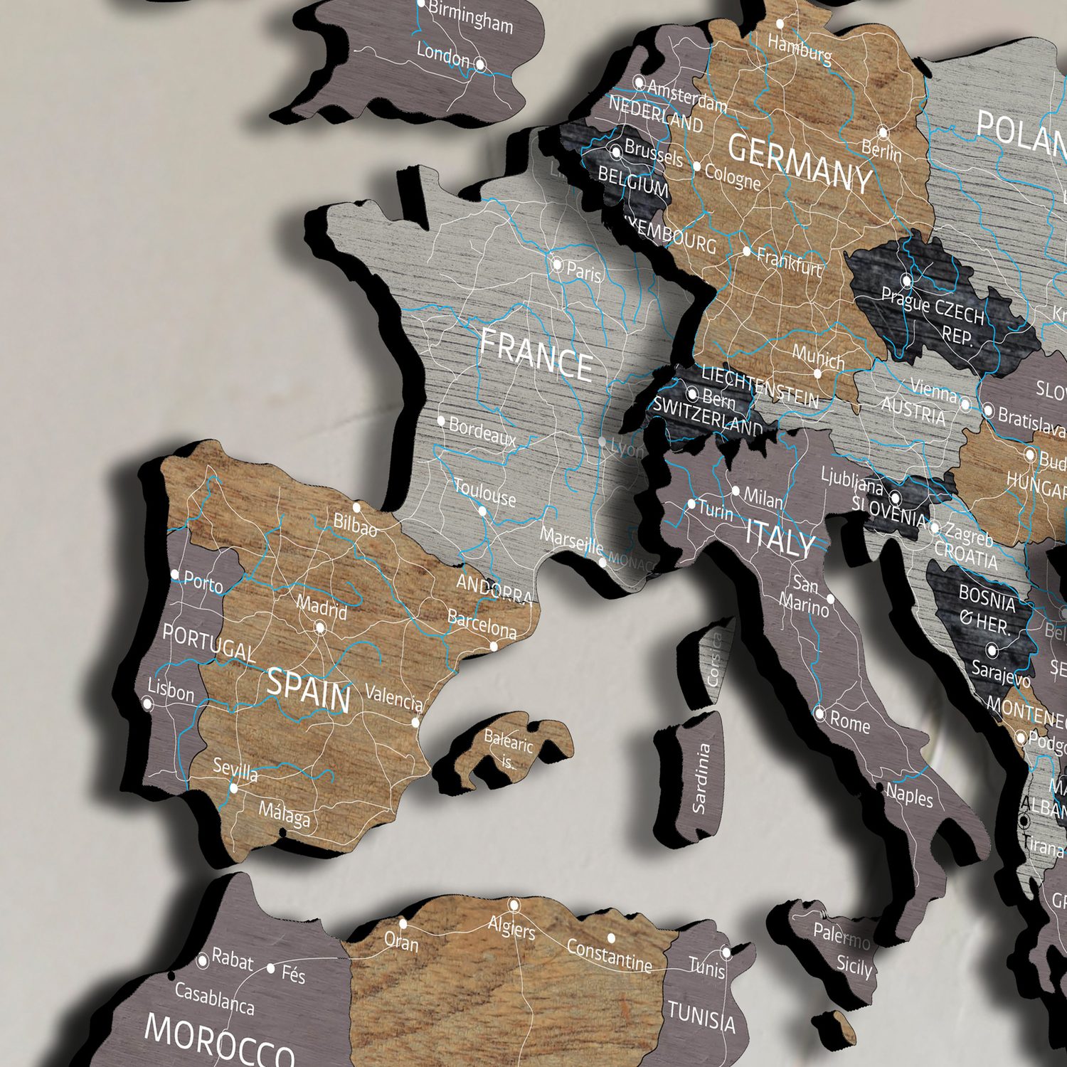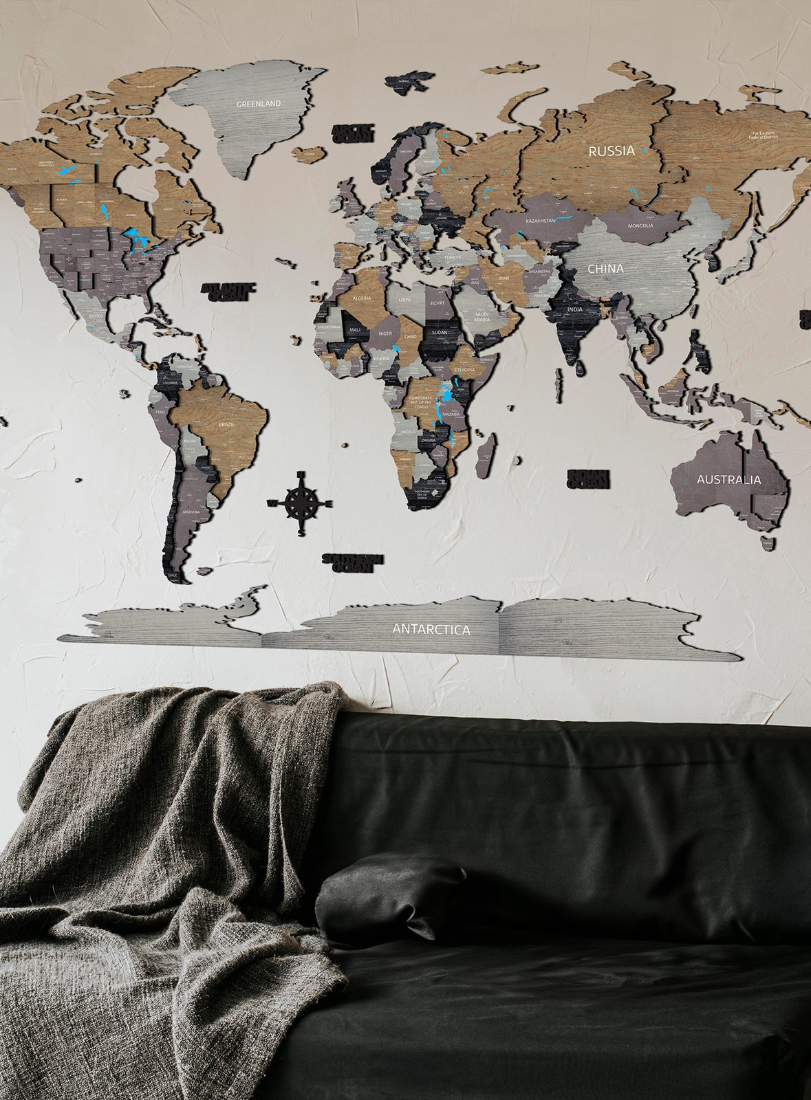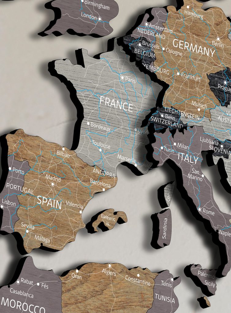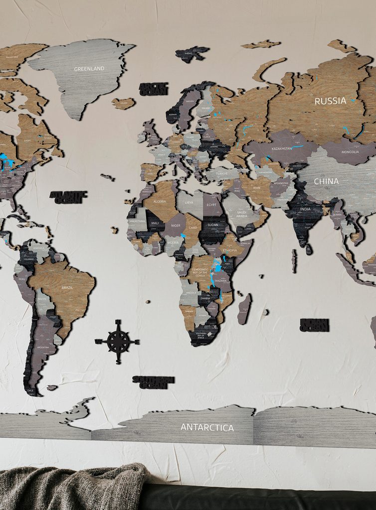 Skutočný 3D Efekt: Každý kontinent a ostrov je precízne vyrobený z viacerých vrstiev HDF dreva zlepených k sebe . Tento vrstvený dizajn zabezpečuje, že mapa vystupuje zo steny a pôsobí dynamicky a trojrozmerne .
