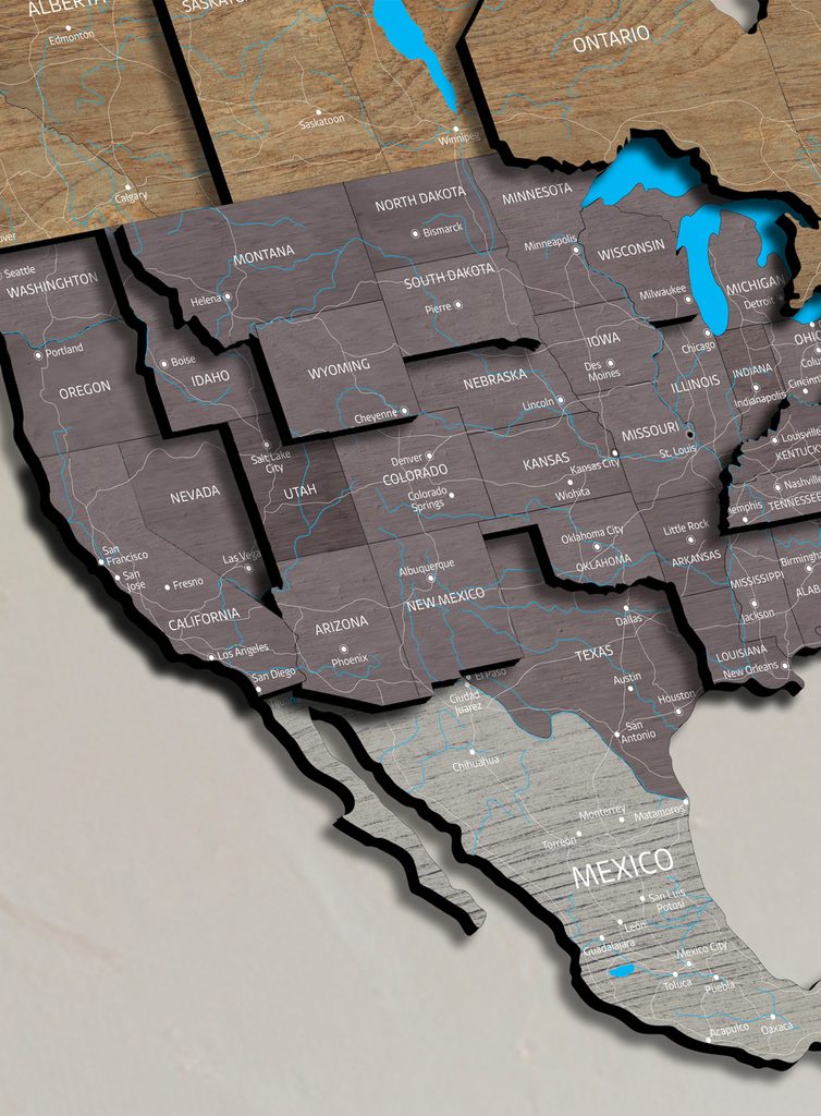 Dokonalý Kontrast: Mapa spája prírodné hnedé drevo (imitácia duba) s matnými sivými a čiernymi prvkami. Táto kombinácia farieb dodáva celému dielu nadčasový charakter.