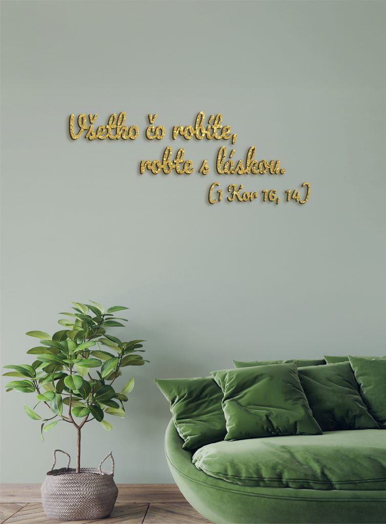 Nádherný drevený citát z HDF dreva, ktorý prinesie do vášho domova hlbokú a inšpirujúcu myšlienku z Biblie: "Všetko čo robíte, robte s láskou (1Kor 16,14)." Tento elegantný citát je starostlivo vyrezaný do kvalitného HDF dreva, pričom každý detail dodáva nápisu vizuálnu príťažlivosť a dlhú životnosť.