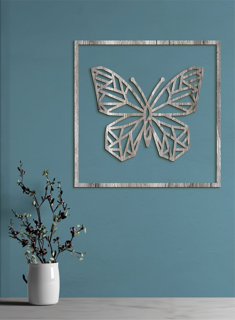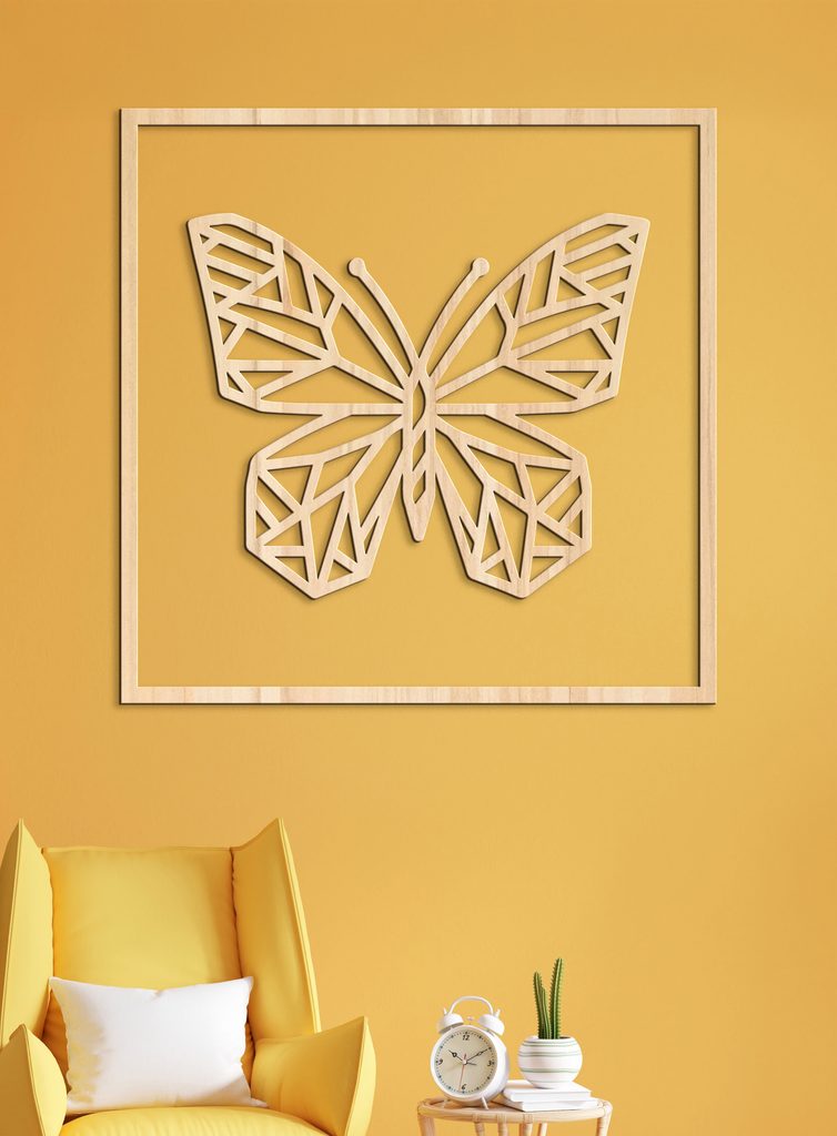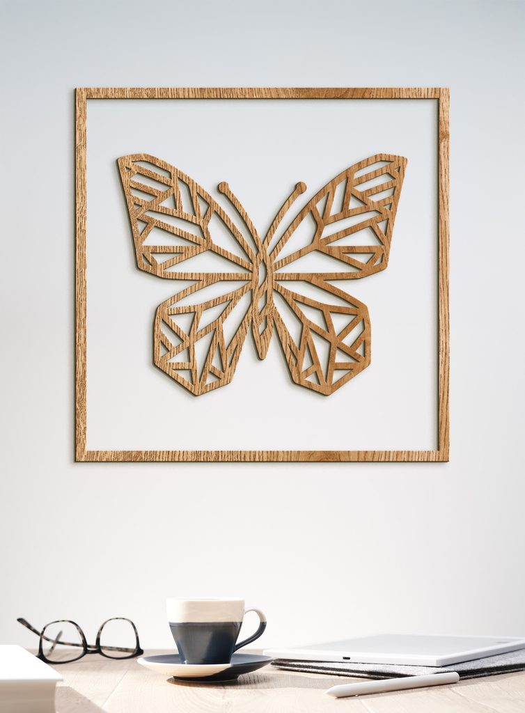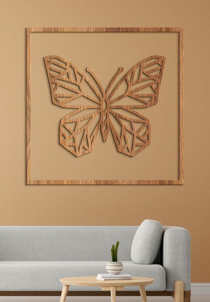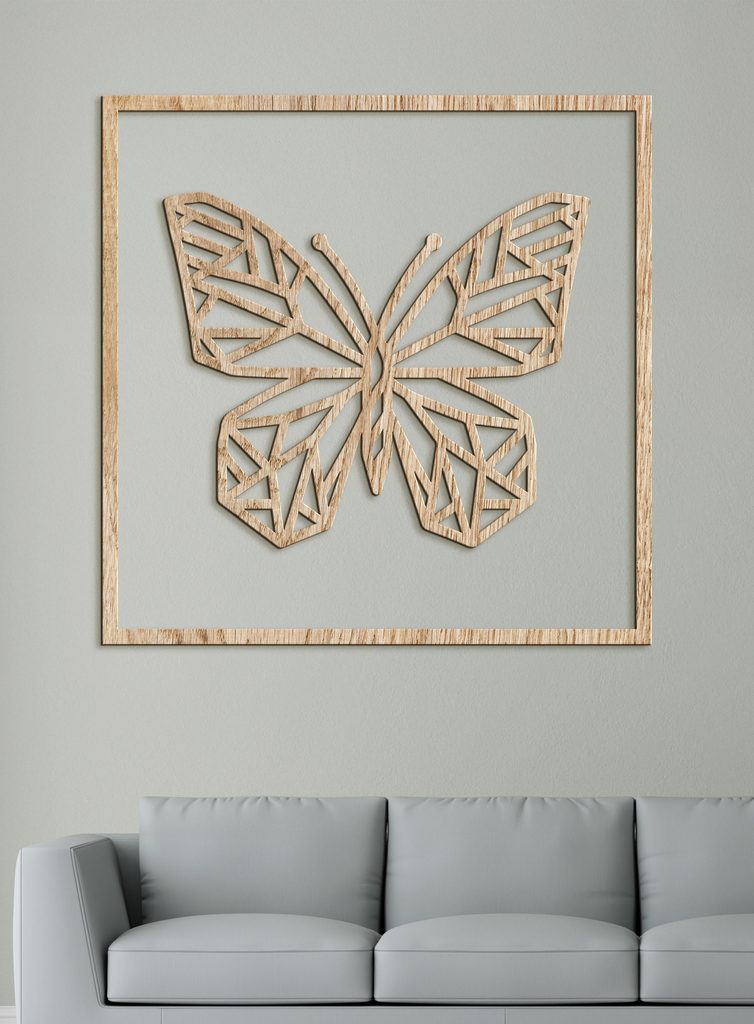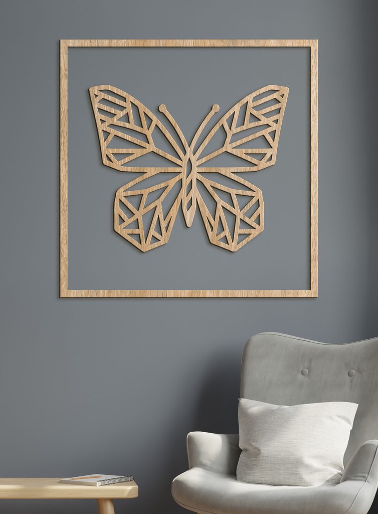 Tento dekoratívny drevený obraz na stenu zobrazuje štýlovú geometrickú siluetu motýľa v štvorcovom rámiku. Motýľ je vytvorený z rôznych tvarov, ktoré spolu vytvárajú moderný a abstraktný dizajn, pripomínajúci vitráž. Použitie geometrických tvarov dodáva obrazu výrazný a moderný vzhľad.
