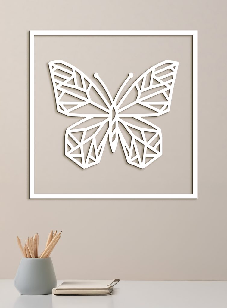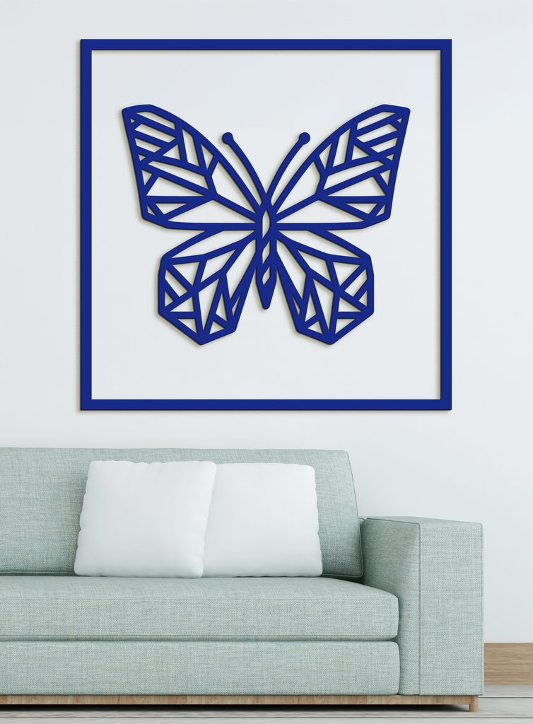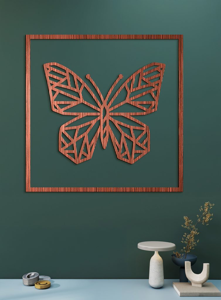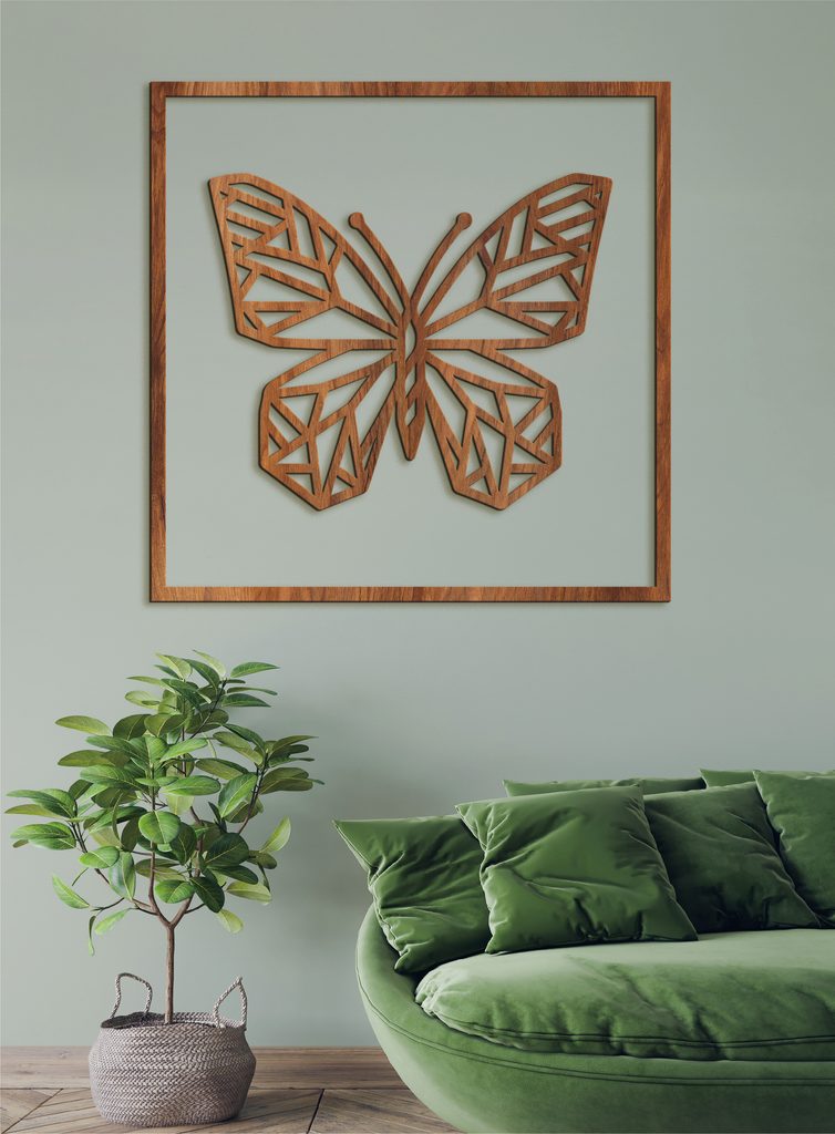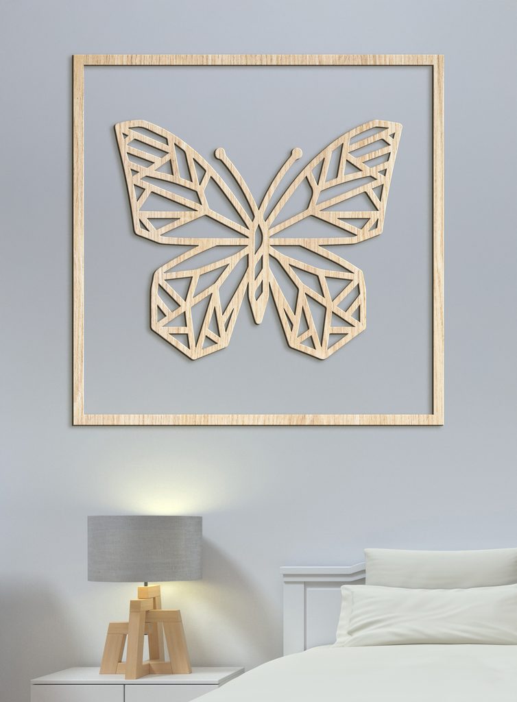 Tento dekoratívny drevený obraz na stenu zobrazuje štýlovú geometrickú siluetu motýľa v štvorcovom rámiku. Motýľ je vytvorený z rôznych tvarov, ktoré spolu vytvárajú moderný a abstraktný dizajn, pripomínajúci vitráž. Použitie geometrických tvarov dodáva obrazu výrazný a moderný vzhľad.