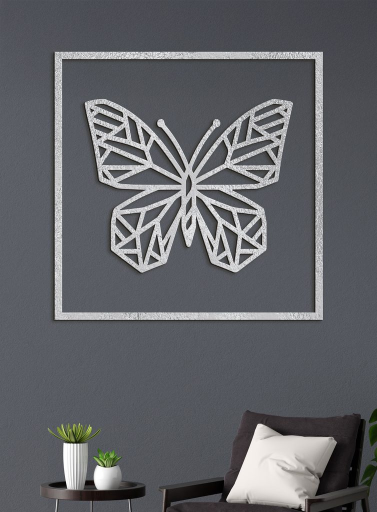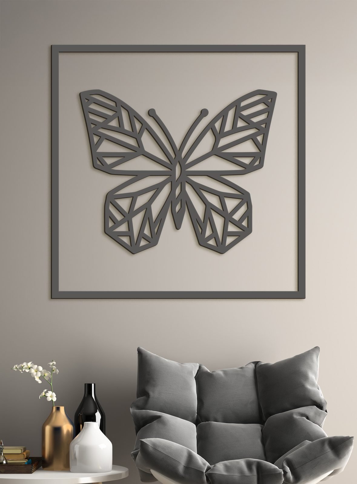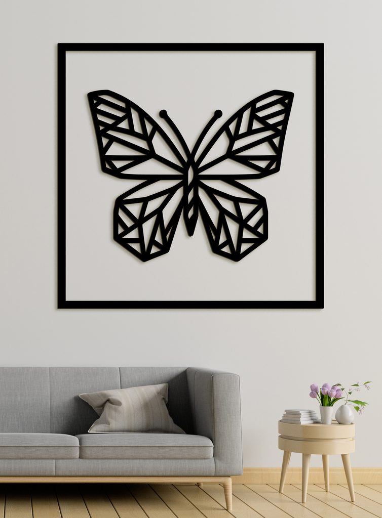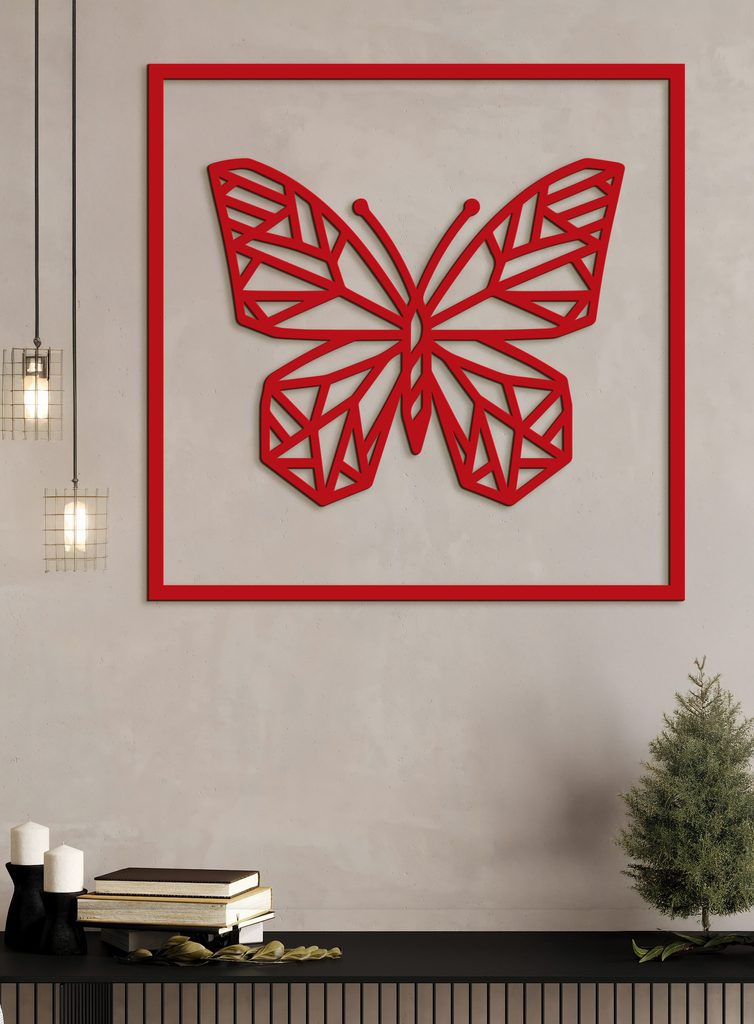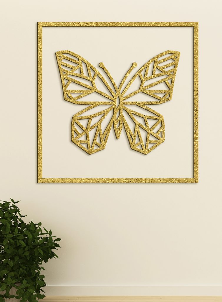 Tento dekoratívny drevený obraz na stenu zobrazuje štýlovú geometrickú siluetu motýľa v štvorcovom rámiku. Motýľ je vytvorený z rôznych tvarov, ktoré spolu vytvárajú moderný a abstraktný dizajn, pripomínajúci vitráž. Použitie geometrických tvarov dodáva obrazu výrazný a moderný vzhľad.