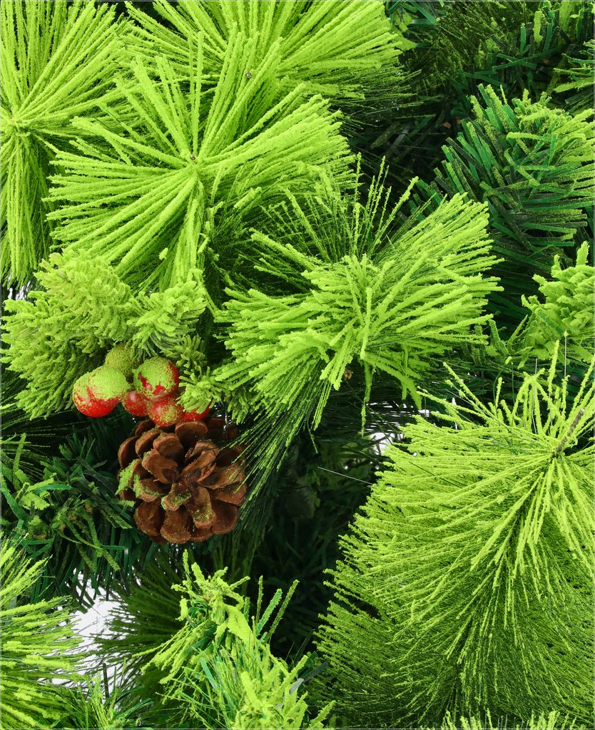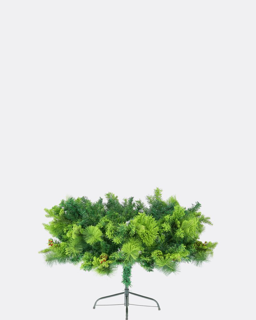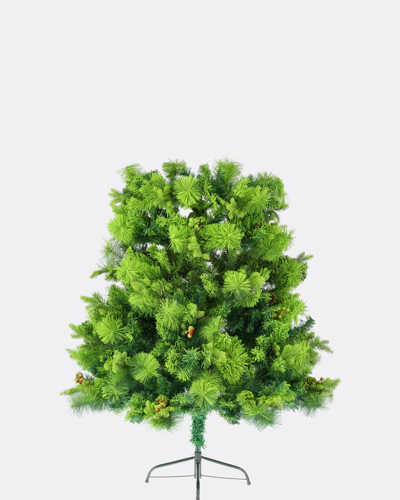 Hustá koruna s jemným a bohatým ihličím vytvára pôsobivý objem, zatiaľ čo prirodzené šišky a bobuľky v jemných odtieňoch zelenej a hnedej mu dodávajú autentickosť. Vďaka tomu je stromček elegantný a plný detailov už aj bez ďalšej výzdoby.