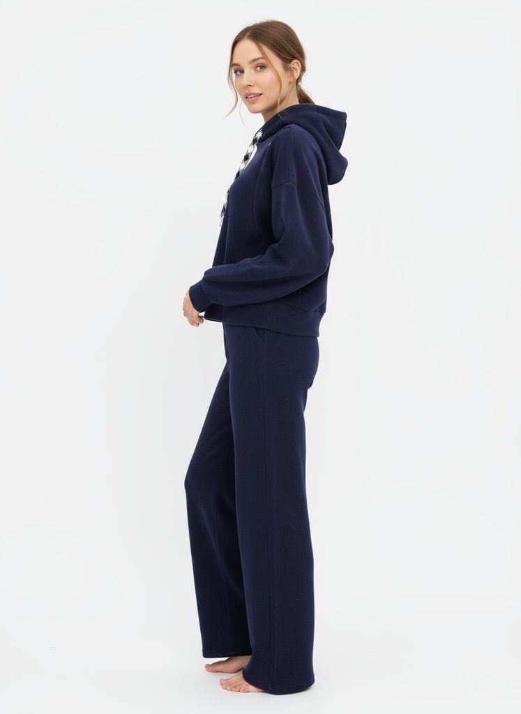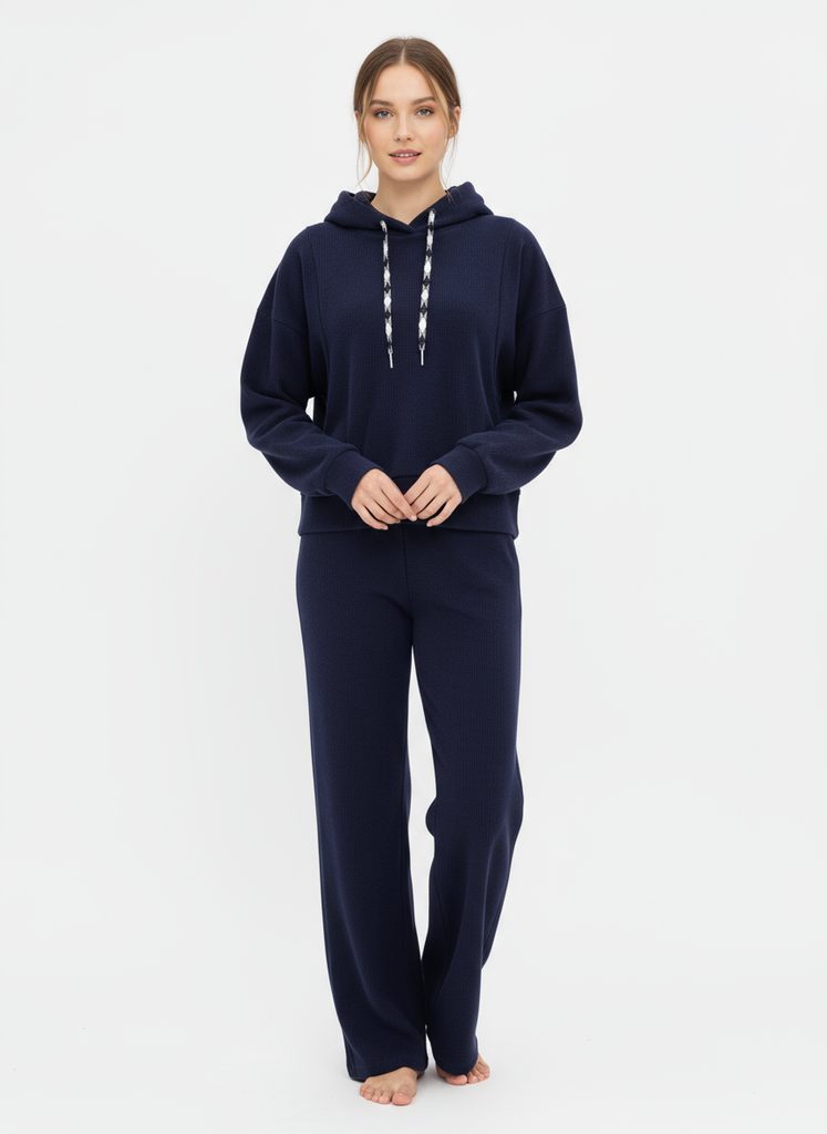 - tepláky: sťahovanie v páse šnúrkou, dve predné vrecká, ozdobné rebrovanie v páse